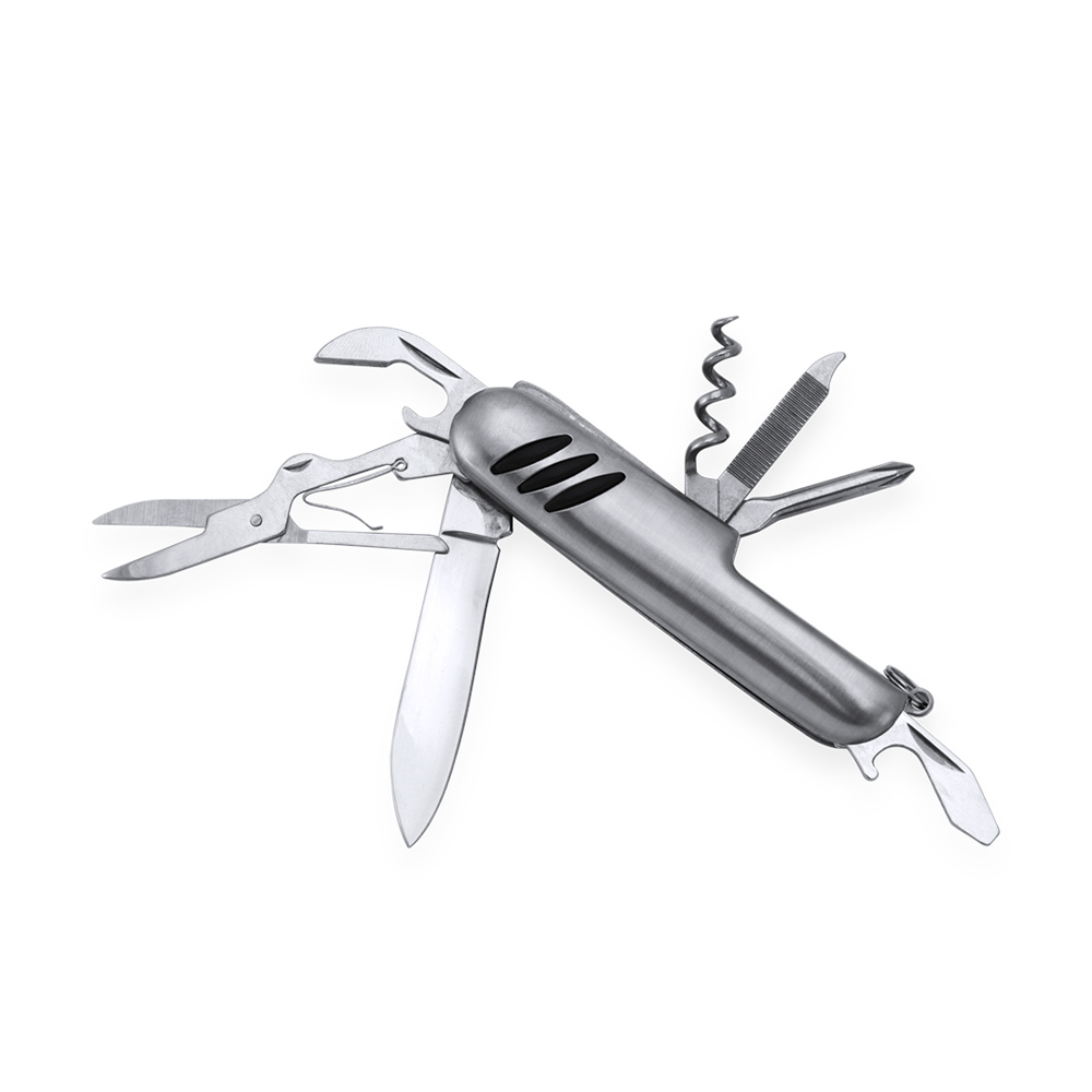Multifunctioneel roestvrij stalen mes met 10 functies en antisliphandvat. Inclusief mes, openers, schroevendraaier, vijl, schaar en sleutelhanger. Gepresenteerd in een doos.
