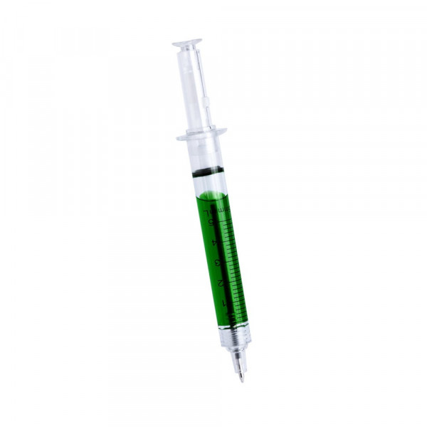 Originele balpen in spuitontwerp en transparante behuizing. Met vloeistof binnenin, in twee kleuren en blauwe inkt.