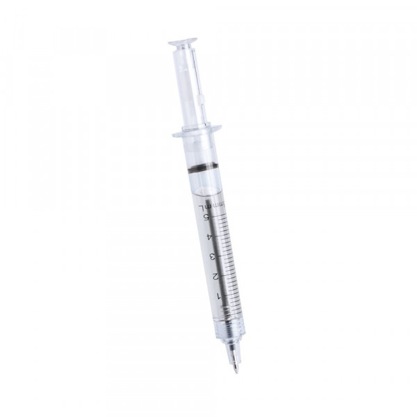 Originele balpen in spuitontwerp en transparante behuizing. Met vloeistof binnenin, in twee kleuren en blauwe inkt.
