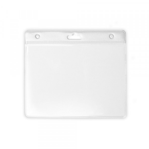 ID badge van PVC met bovenkant in gevarieerde kleuren, transparante voorkant en achterzijde in wit.