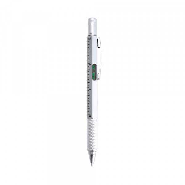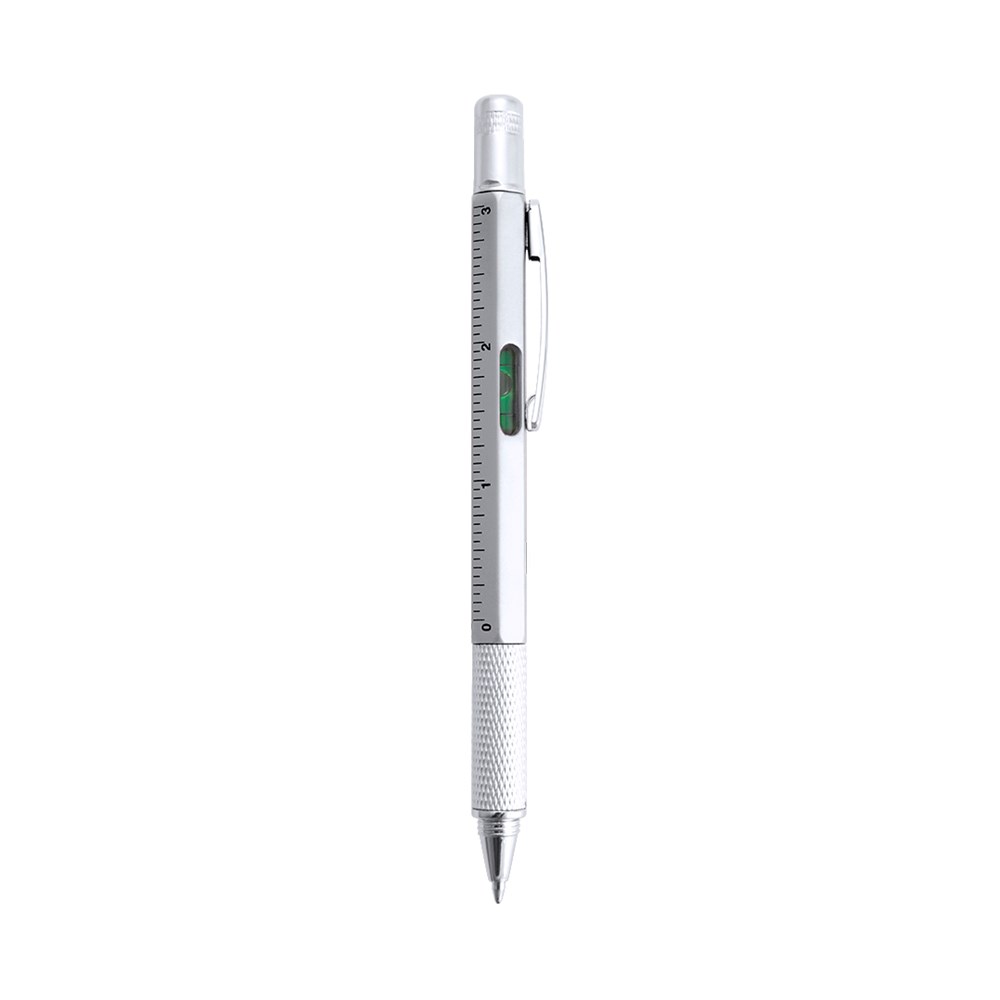 Multi-tool balpen 4-in-1 met draaimechanisme, in diverse kleuren en met zachte grip. Met ingebouwd waterpas, liniaal met metrisch systeem in centimeter / inch en dubbele schroevendraaier - plat en kruiskopvormig. Met metalen clip en blauwe inkt.