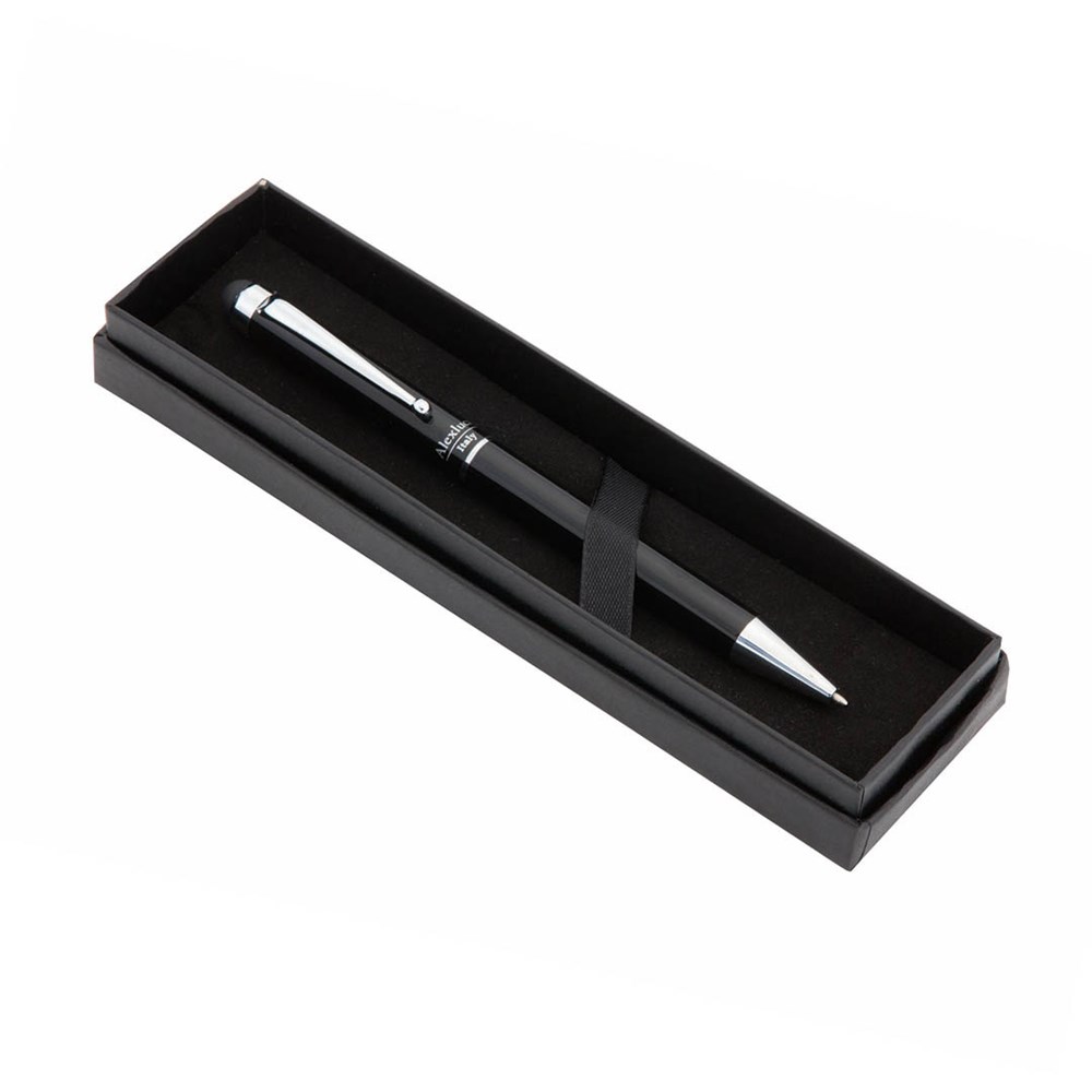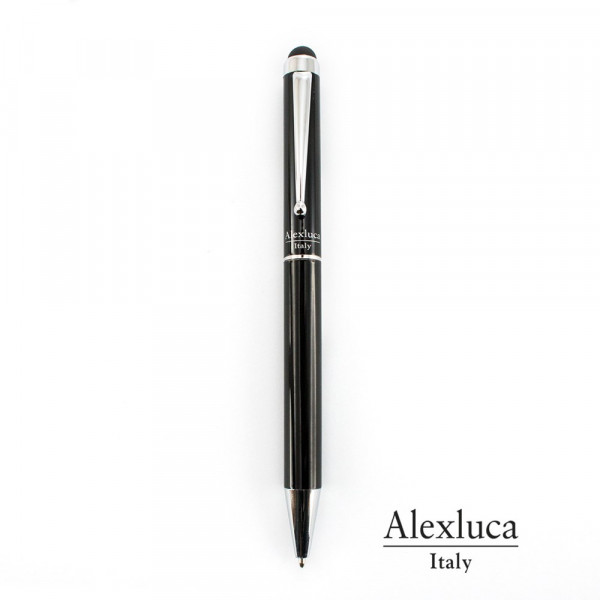 Alexluca balpen met draaimechanisme en gladde metalen behuizing in een elegante zwarte kleur. Clip en punt in bijpassende kleur. Gepresenteerd in een zwarte doos met het merklogo. Blauwe inkt.
