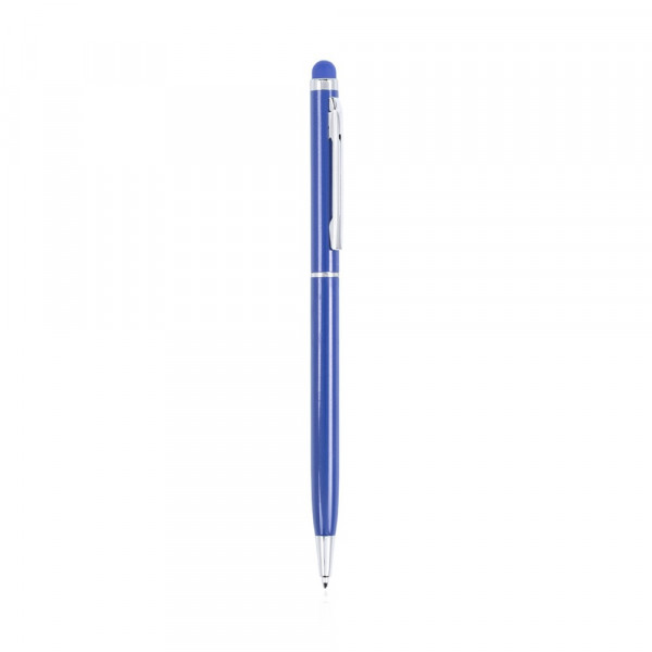Stylus balpen met draai-mechanisme en aluminium body met gladde, metallic afwerking in gevarieerde kleuren en stylus in bijpassende kleur. clip en ringen in zilveren kleur. Blauwe inkt.
