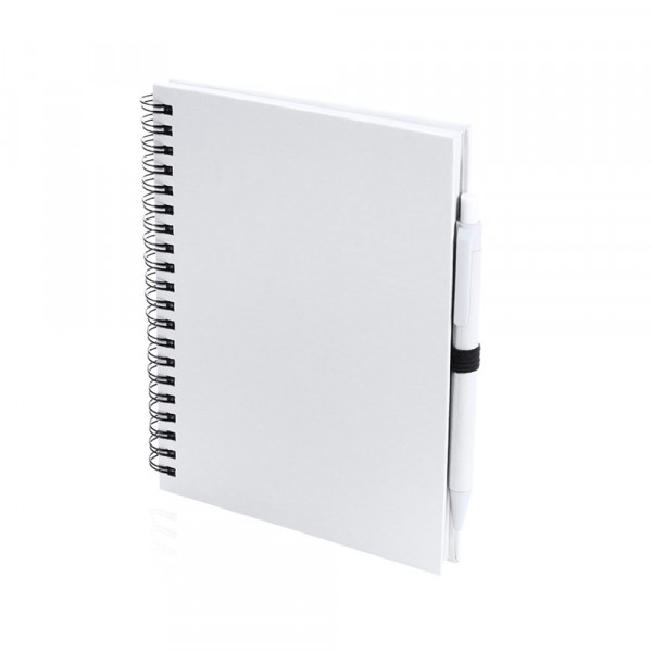 Notitieboek en pennenset. Ring notitieboekje met zacht aanvoelende kaft van gerecycled karton, en bijpassende pen. Bevat 70 effen pagina's met penhouder. Verkrijgbaar in een verschillende kleuren.