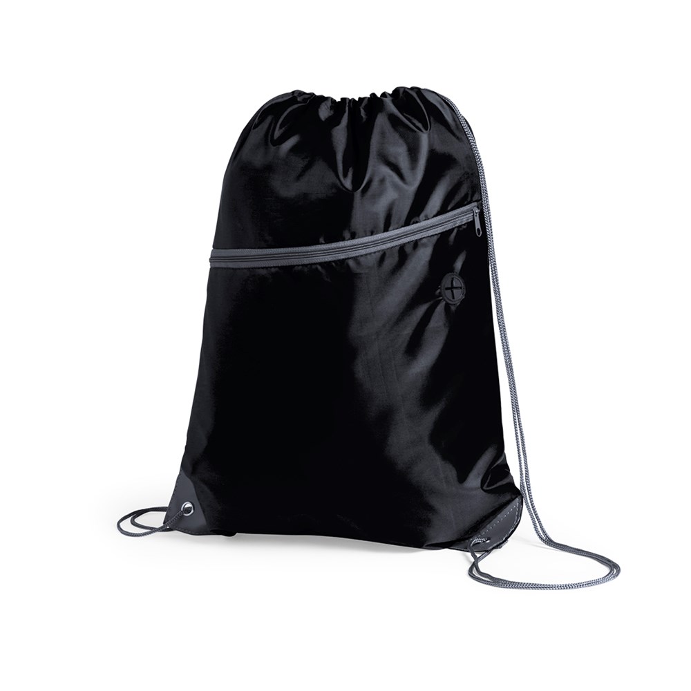 Touwrugzak van zacht 210D polyester. Met voorvak met rits en koptelefoonuitgang. Zelfspannende koorden in grijze kleur, bijpassende ritssluiting en hoeken met metalen ringen en versteviging van kunstleer. In een groot aantal kleuren.