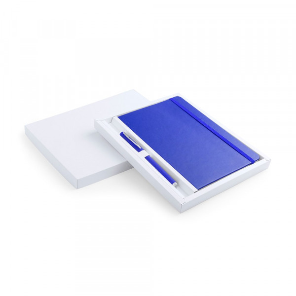 Kladblok set met soft-touch cover van PU-leer en gladde pen in bijpassende kleur. 100 blanco vellen met elastische band en stoffen boekenlegger in bijpassende kleur. Gepresenteerd in een elegante, witte, gestanste kartonnen doos. Balpen met blauwe inkt.