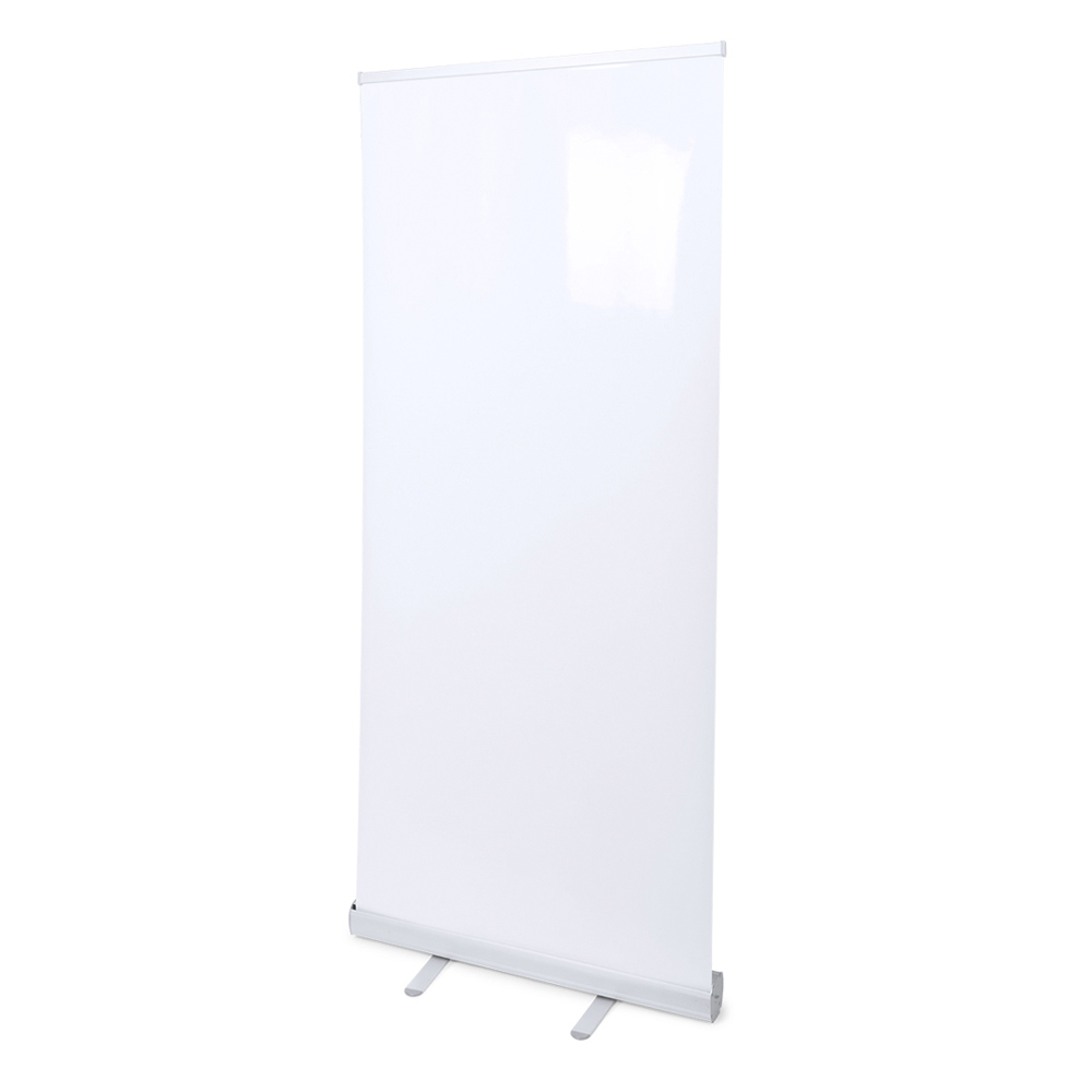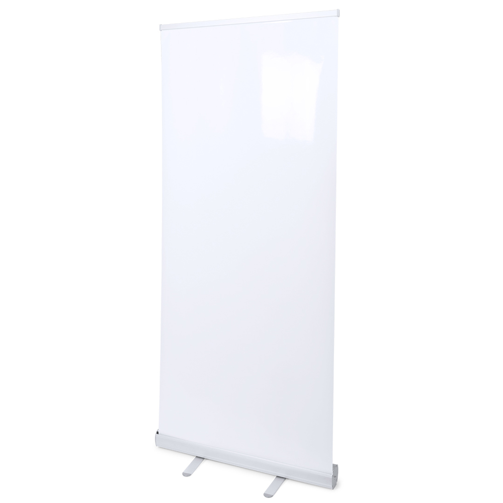 Banner van 85x200 cm van stevig polypropyleen met hoge dichtheid, speciaal ontworpen voor afdrukken in full colour. Met aluminium beugels en bevestigingshaak. Presentatie opgerold in stoffen tas.