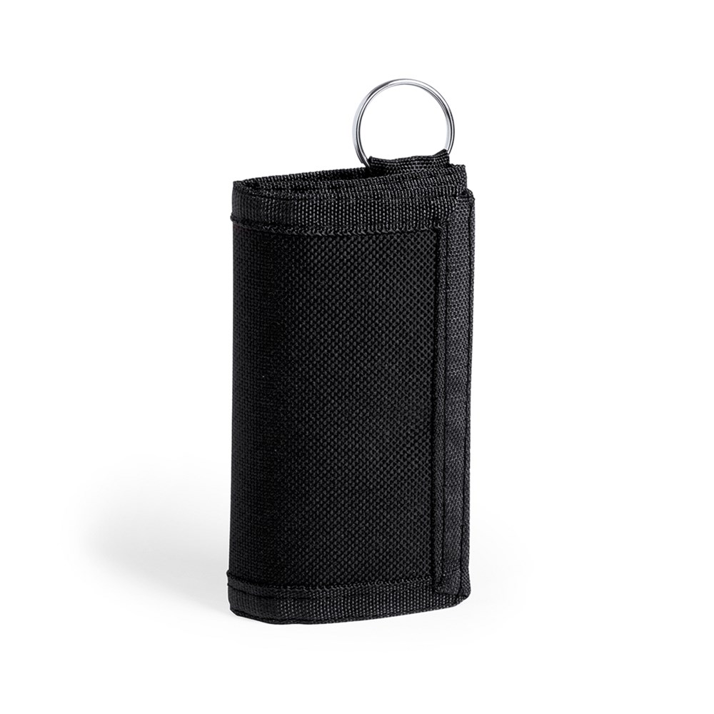 Sleutelhanger portemonnee van stevig polyester 600D in diverse kleuren en klittenband sluiting. Binnenkant met portefeuille met ritssluiting, kaartvak en sleutelhanger.