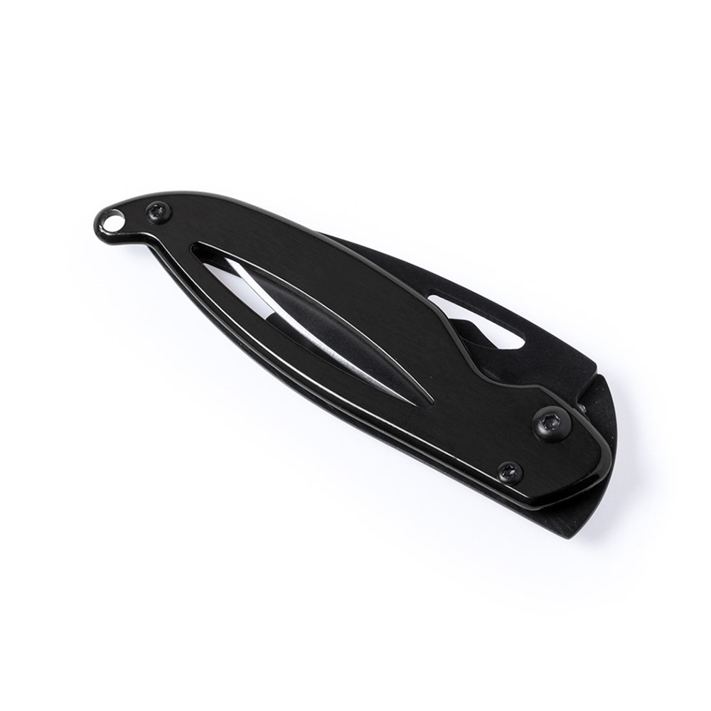 Hoogwaardig mes met lemmet van donker roestvrij staal en handvat van roestvrij staal met veiligheidsslot. In diverse kleuren en gepresenteerd in een individuele doos.
