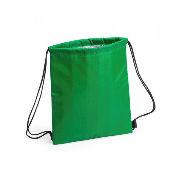 Koelrugzak voor kinderen van zacht polyester in vrolijke kleuren. Met zwarte zelfsluitende koorden en versterkte hoeken. Isothermische binnenkant met aluminium afwerking.