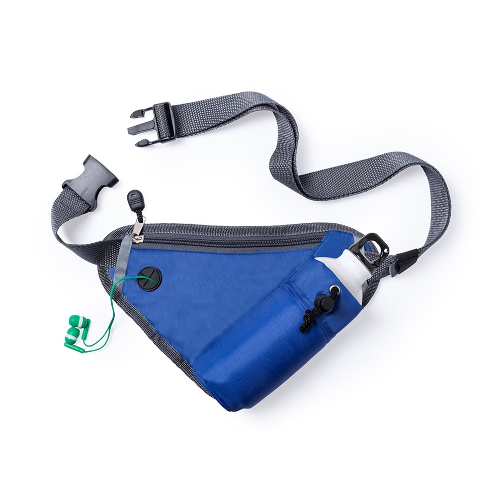Driehoekige design heuptas van zacht polyester 210D in gevarieerde kleuren. Ontworpen voor sport- en vrijetijdsactiviteiten. Met ritsvak, hoofdtelefoonuitgang, verstelbare fleszak en verstelbare heupband met gespsluiting. Fles niet inbegrepen