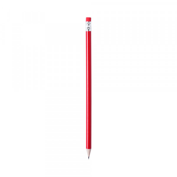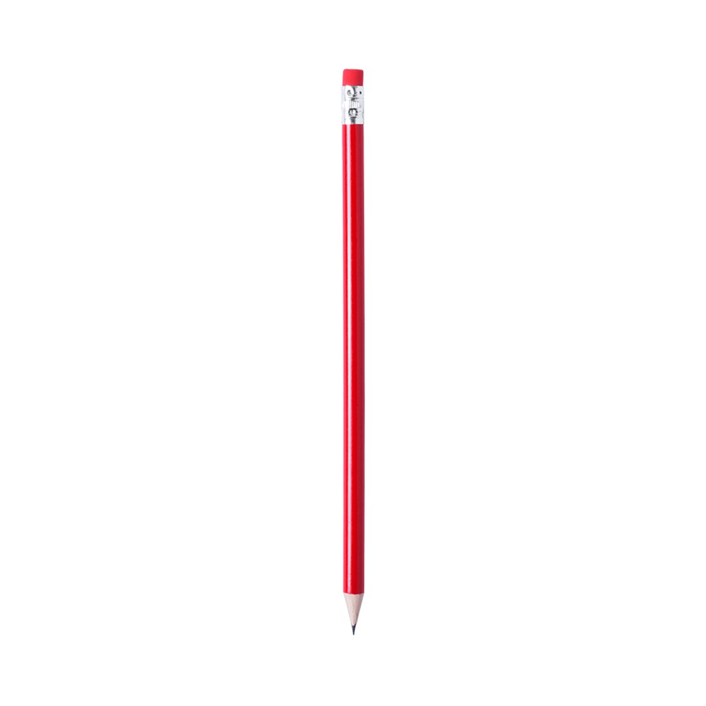 Houten potlood met glanzende afwerking. Met ronde houder en bijpassend gekleurd rubber. Verkrijgbaar in een groot aantal kleuren. Zwarte kleurige stift en geslepen punt.