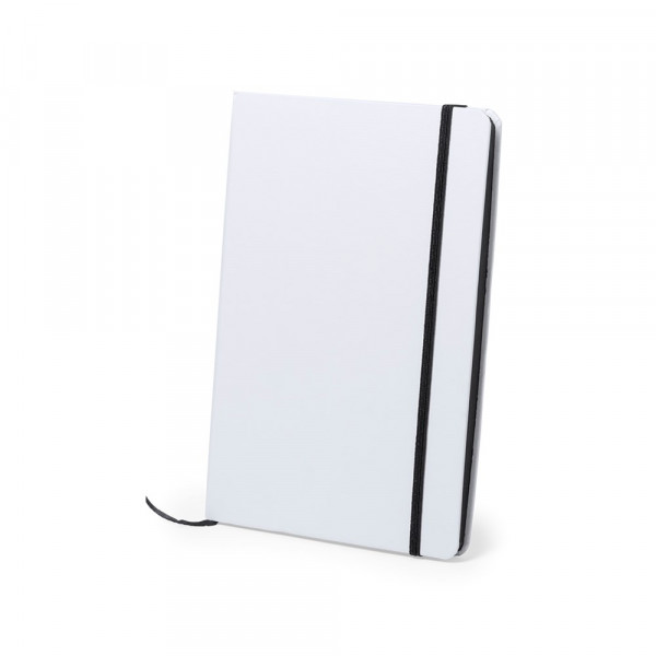 Kladblok met stevige covers in het wit. 100 effen vellen met zijden in leuke kleuren, elastische band en bladwijzer in bijpassende kleur.