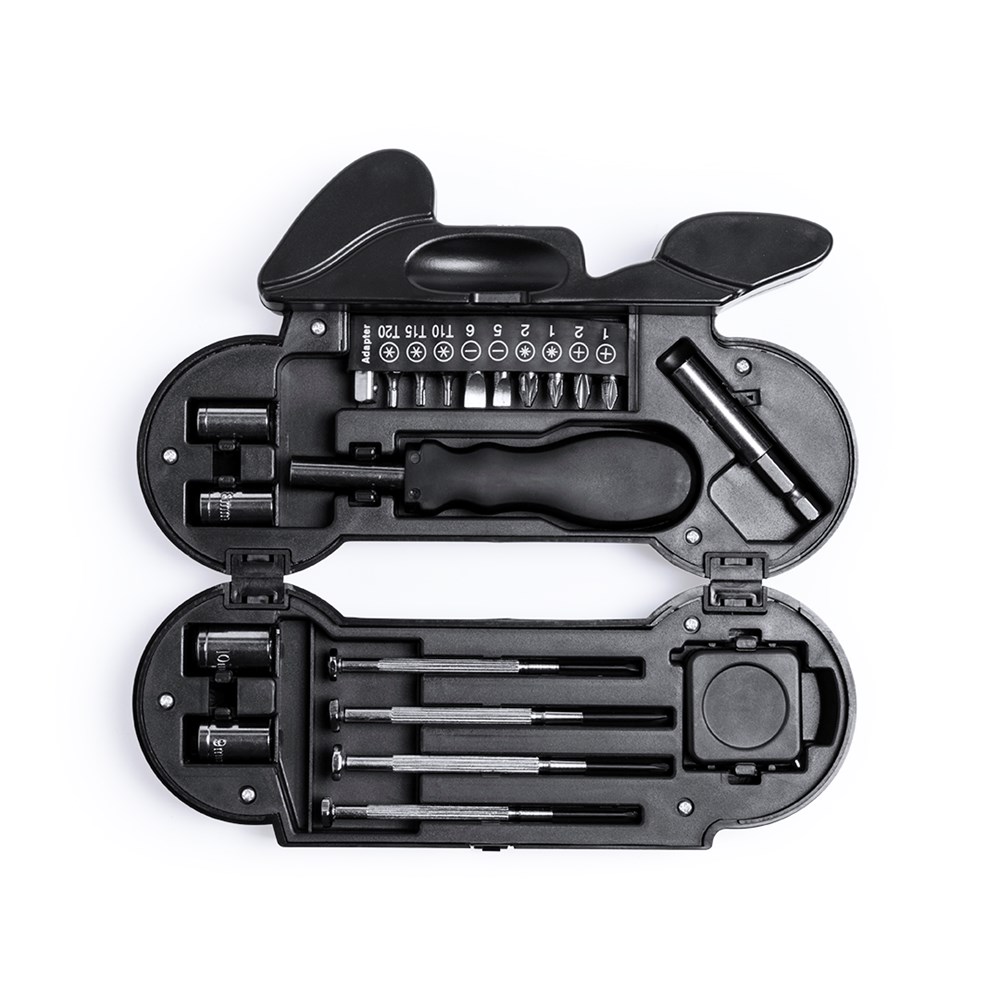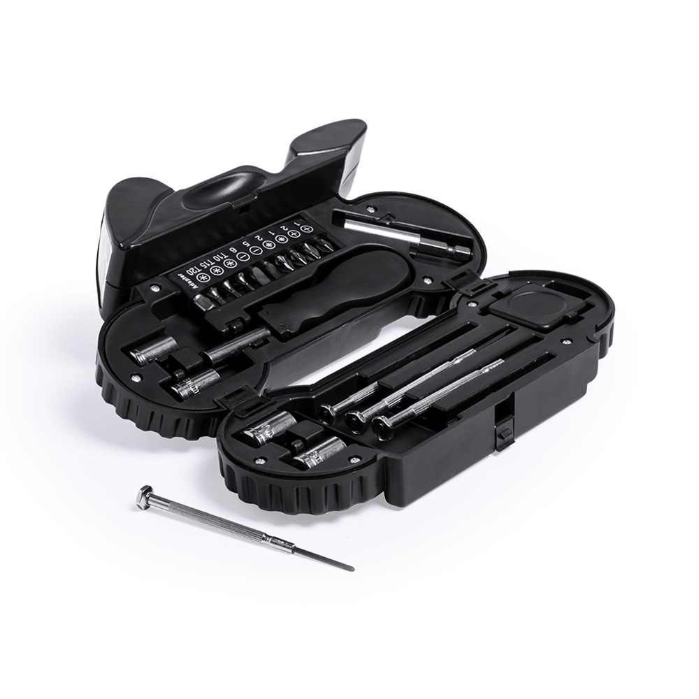 Gereedschapset van 14 accessoires in stevige behuizing in motorontwerp, met ingebouwd 4 LED-zaklampje. Inclusief set precisie-schroevendraaiers, klemgereedschap, platte- en kruiskopschroevendraaierkoppen en moersleutels voor zeskantmoeren. Knoopcelbatterijen inbegrepen. Gepresenteerd in een individuele doos.
