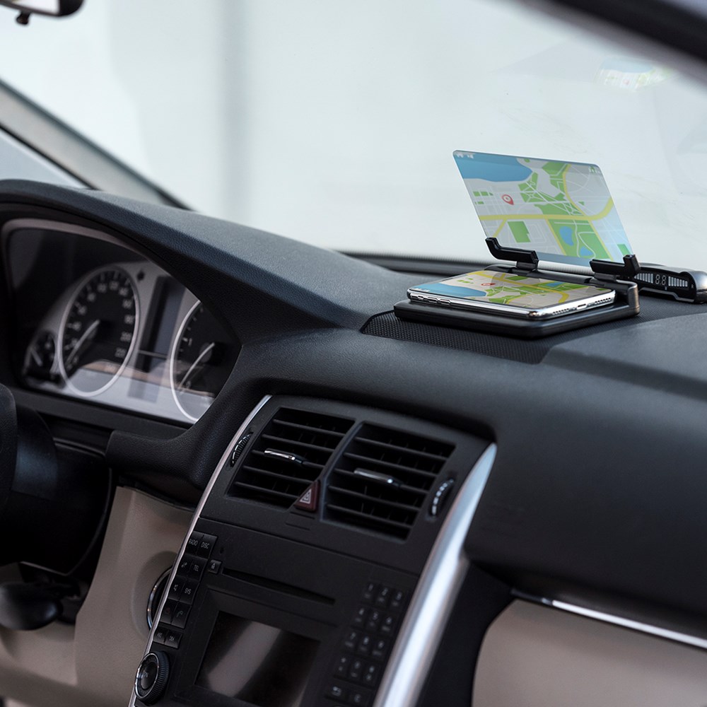 Ondersteuningsscherm voor auto. Met instelbare spiegelbeeldverdubbelaar en ultra-zelfklevend anti-slip oppervlak voor dashboard en smartphone. Gepresenteerd in een aantrekkelijke designdoos.