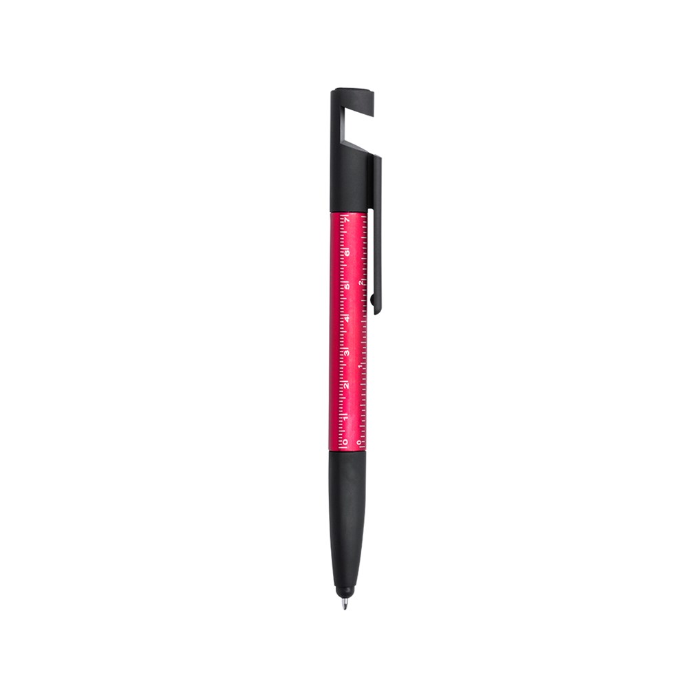 7-in-1 balpen met draai-mechanisme in diverse kleuren. Met houder voor telefoon, aanwijzer, schermreiniger, ingebouwde liniaal-cm en inches-, platte kop en kruiskopschroevendraaiers. Blauwe inkt.