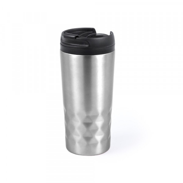 Roestvrijstalen tafelmodel beker met een inhoud van 310 ml. Met easy-open dispenserdeksel en zachte schuimstof gevoerde bodem. Het is ideaal voor op je bureau, tafel of elk ander oppervlak waar je rustig van je favoriete drankje kunt genieten. Met originele glanzende afwerking en ruitdesign.