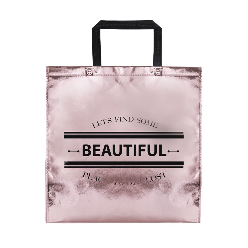 Gelamineerde, non-woven tas in metallic. Verkrijgbaar in het goud, zilver en rose. Tas is voorzien van korte hengsels en heeft een draagvermogen van 7 kg.