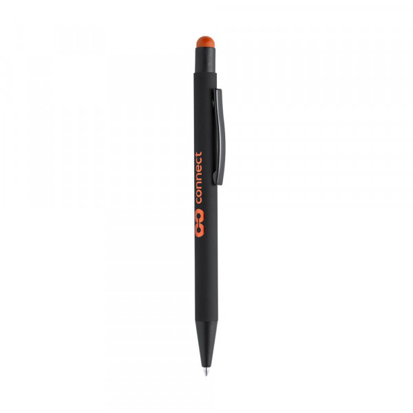 Styluspen met drukknopmechanisme, behuizing met effen zwarte afwerking en drukknop in verschillende kleuren. Metalen clip in zwarte kleur. Speciaal ontworpen voor lasergravering. Licht passend bij de kleur van de top. Jumbo vulling voorzien van blauw schrijvende inkt