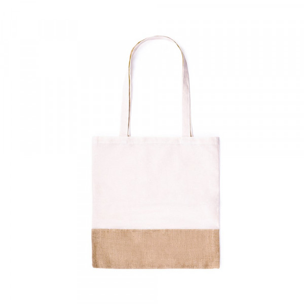 Eco-vriendelijke tas gemaakt van natuurlijke materialen. Jute an katoen 245g/m2. Aantrekkelijk ontwerp bestaande uit twee kleuren. De hengsels van de tas zijn 70cm lang, en de tas heeft een draagvermogen van 8kg.