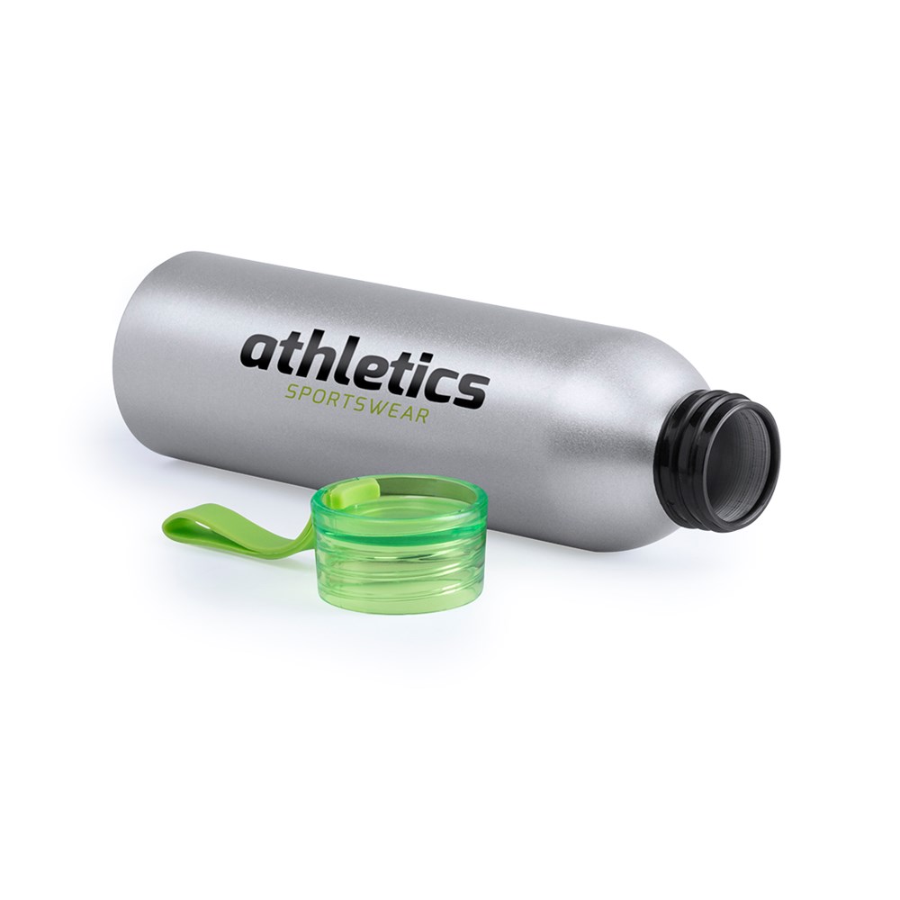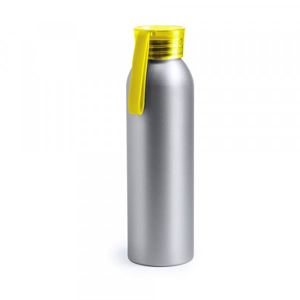 Aluminium fles met een inhoud van 650 ml. Zilveren behuizing, met opschroefbare veiligheidsdop in een breed scala aan transparante kleuren. Bijpassende transportband van TPR-materiaal.