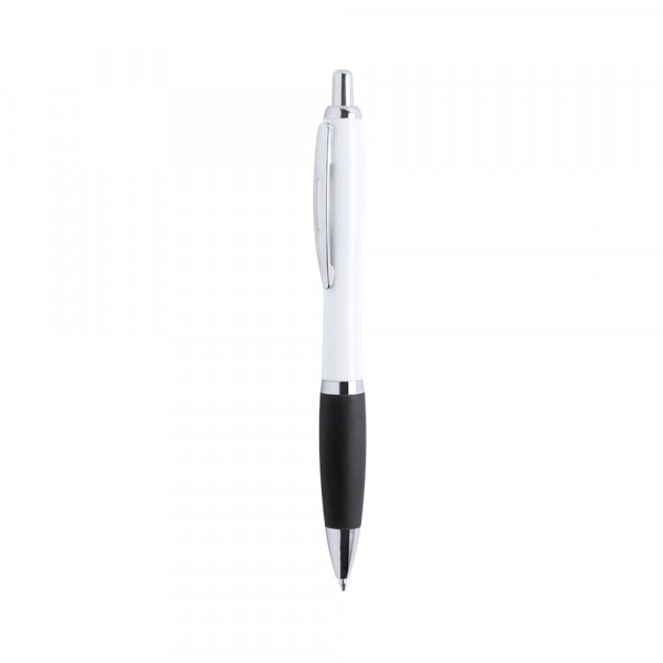 Balpen in 2 kleurig design. Met witte body en grip in diverse kleuren. Met drukmechanisme en chromen details. Metalen clip en blauwe inkt.