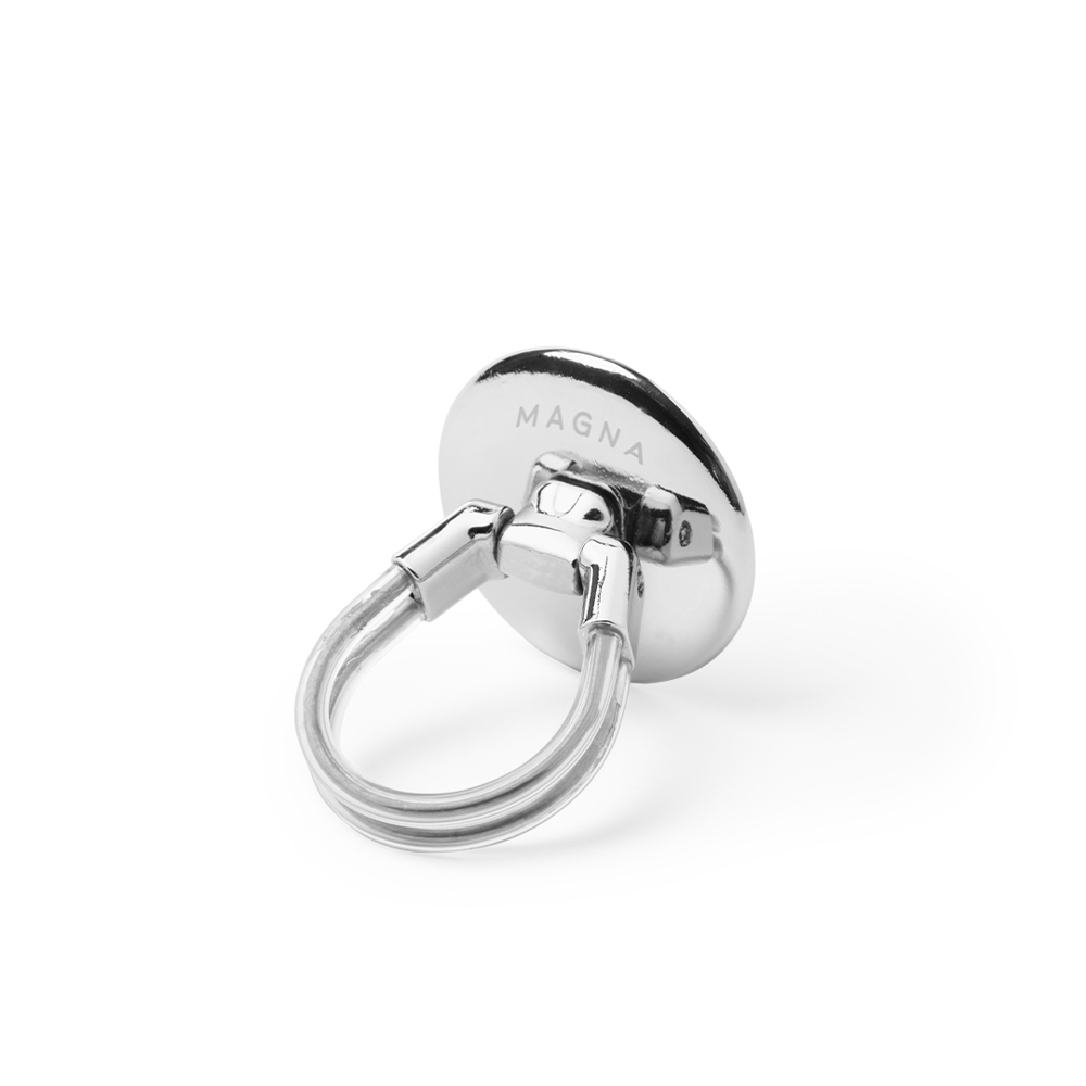 Selfie, smartphonehouder in verchroomd metaal. In een elegant ontwerp en met 3M plakband, extra sterke fixatie en residuvrij bij loskoppeling van het apparaat. Achterkant, dubbele houderring voor vingers en voertuigdashboard. Gepresenteerd in een individuele designtas.