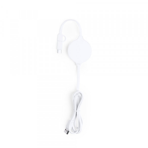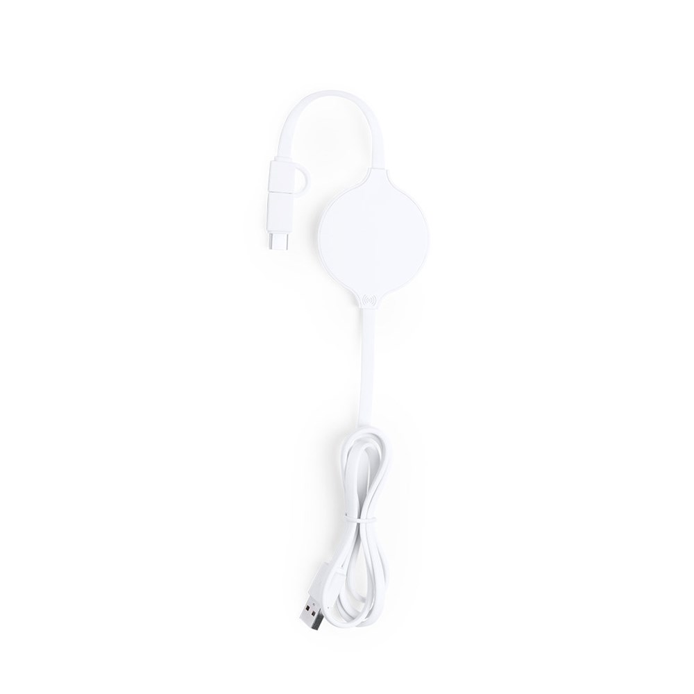 Draadloze, ultracompacte lader in zwart-wit, witte kleur. Verbindingen dubbele micro-USB en Lightning, met Type C-adapter en oplaadlampje. Compatibel met apparaten die zijn uitgerust met draadloze oplaadtechnologie.