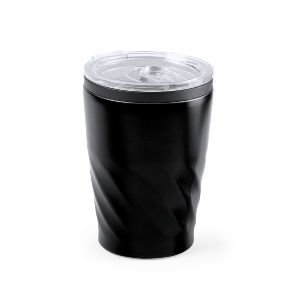 Tafelglas van roestvrij staal met een inhoud van 350 ml. Body met afgeschuind design, met zwarte ring. Met originele transparante maatdop en easy-opener. Het is ideaal voor op je bureau, tafel of elk ander oppervlak waar je rustig van je favoriete drankje kunt genieten.