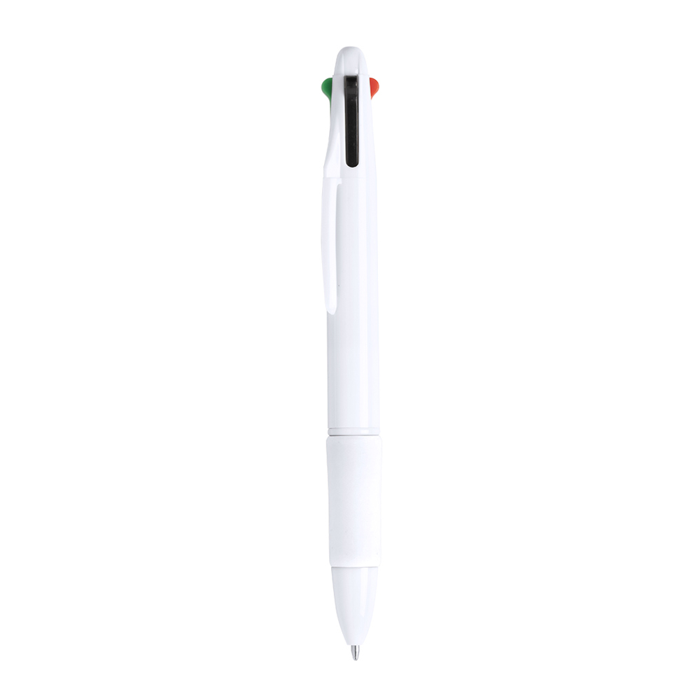 Balpen 4-in-1 met uitschuifbaar push-upmechanisme, klassiek ontwerp en effen witte body. Zacht aanvoelende, kleurgrip in heldere tinten. 4 cartridges in blauwe, rode, zwarte en groene inkt.