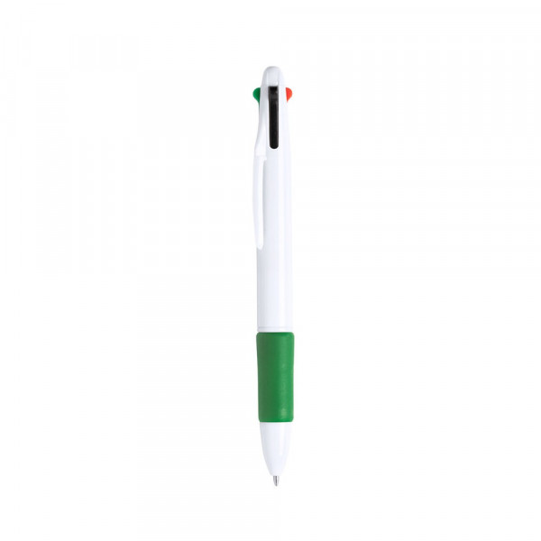 Balpen 4-in-1 met uitschuifbaar push-upmechanisme, klassiek ontwerp en effen witte body. Zacht aanvoelende, kleurgrip in heldere tinten. 4 cartridges in blauwe, rode, zwarte en groene inkt.