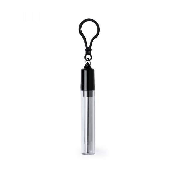 Herbruikbaar en rekbaar rietje in roestvrij staal met siliconen punt. Inclusief reinigingsaccessoire en gepresenteerd in een transparante koffer met draagaccessoire.