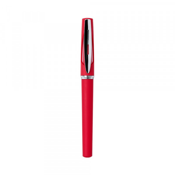 Helder ontworpen, tweekleurige kaprol met zachte romp in opvallende kleuren. Accessoires in glanzende zilveren kleur met transparant detail. Blauwe gel inkt.