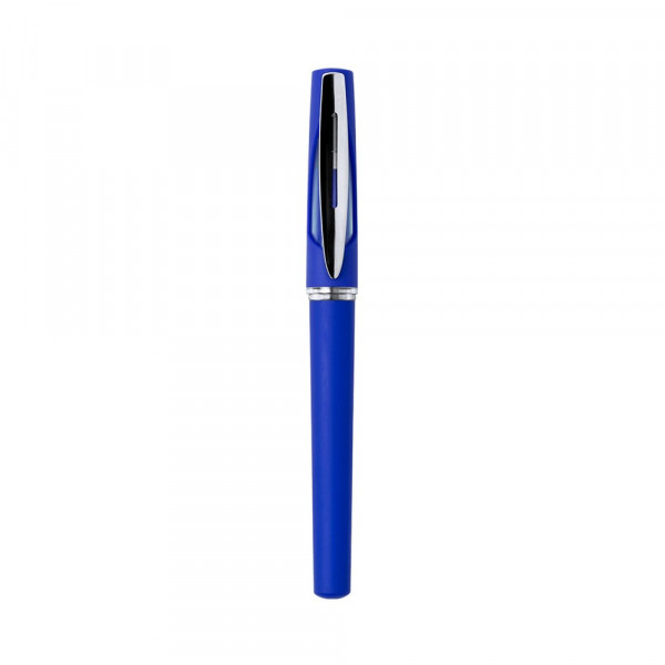 Helder ontworpen, tweekleurige kaprol met zachte romp in opvallende kleuren. Accessoires in glanzende zilveren kleur met transparant detail. Blauwe gel inkt.