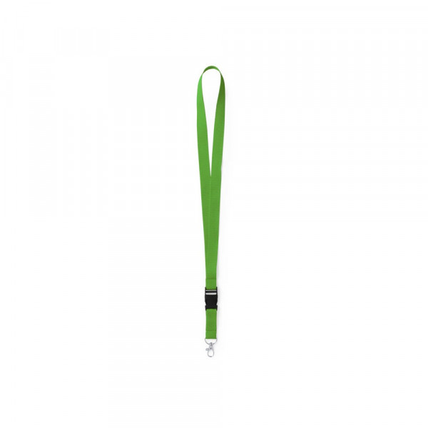Sleutelkoord van resistent polyester met multifunctionele gespsluiting en metalen haak. Verkrijgbaar in een breed scala van levendige kleuren.