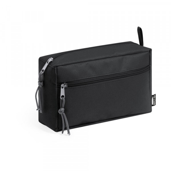 Natuurlijn schoonheidszakje in RPET-materiaal, verkregen uit gerecyclede plastic materialen, om het hergebruik van plastic resten te stimuleren en bij te dragen aan de duurzaamheid van de aarde. Hoofdcompartiment en voorvak met ritssluiting en riemen in trekkers voor een comfortabele opening, met draagriem in bijpassende kleur en RPET-onderscheidend zijlabel. Verkrijgbaar in een breed scala aan kleuren.