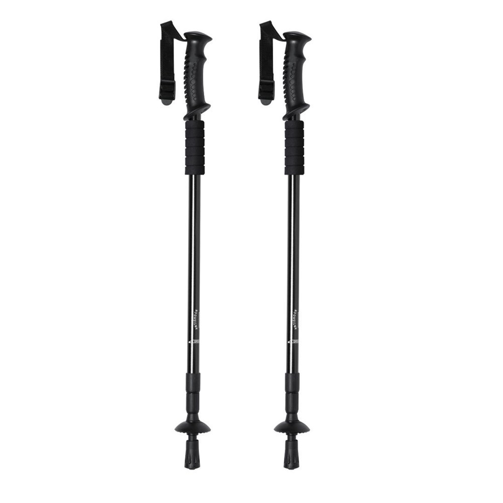 Set vouwstokken met aluminium behuizing, anti-schokmechanisme en zachte schuimrubberen handsteunen. Comfortabele ergonomische, verstelbare veiligheidsgordel en sneeuwaccessoire. Versterkt grondcontactvlak. Gepresenteerd in een individuele tas met schouderband. Stokken verkrijgbaar in 3 kleuren.