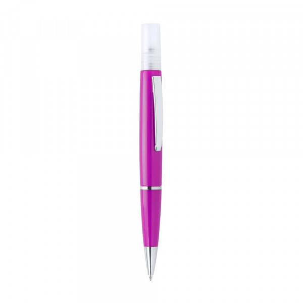Hygiënische balpen met geïntegreerde oplaadbare spray en beschermkap. Duurzame glanzende ABS afwerking met stijlvolle metalen clip en comfortabele blauwe inkt grip en schrijven. Spuitcapaciteit 3ml. Vloeistof niet inbegrepen. Beschikbaar in een breed aanbod aan kleuren