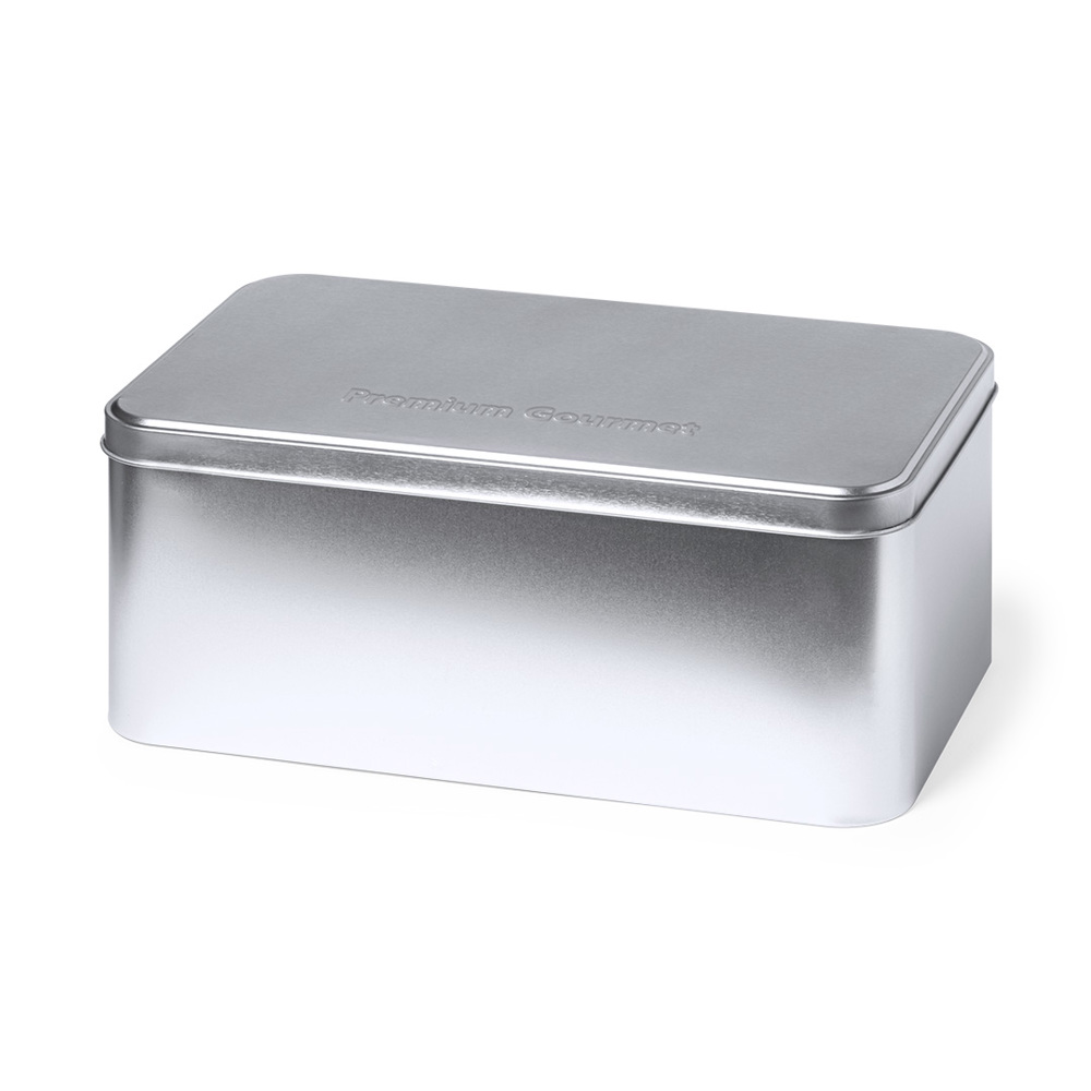 Presentatiedoos in rechthoekig formaat, gemaakt van resistent metaal met zilveren afwerking en bijpassend deksel.