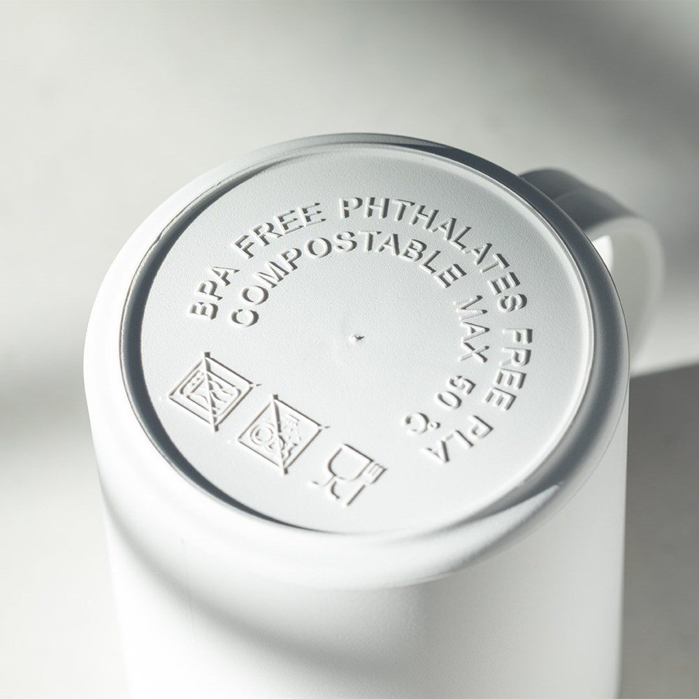Natuurlijn mok, gemaakt van 100% composteerbare PLA. 350 ml inhoud, in een stevige afwerking en BPA-vrij.Product gemaakt van PLA-materiaal, uit hernieuwbare grondstoffen, met belangrijke eigenschappen zoals veelzijdigheid en weerstand, waaronder de composteerbaarheid.
