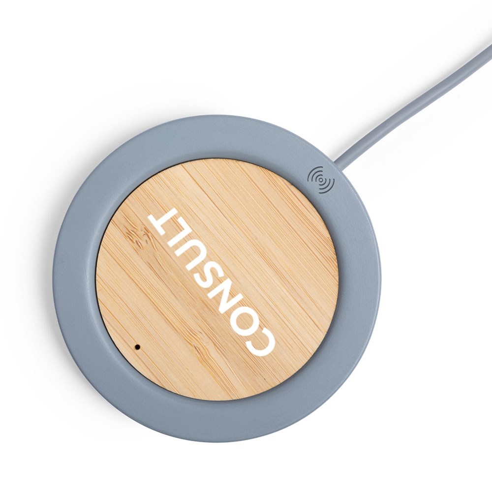 Draadloze lader van rond ontwerp in combinatie met natuurlijke gesneden bamboestukken en kalksteencement, een conglomeraat gevormd door het mengsel van natuurlijke materialen, voornamelijk gemalen kalksteen en water, het verkrijgen van een materiaal met een grote consistentie en duurzaamheid.USB-oplaadkabel in bijpassende kleur, compatibel met apparaten die zijn uitgerust met draadloze oplaadtechnologie. Veiligheidsbescherming om oververhitting, overlading en kortsluiting te voorkomen. Gepresenteerd in een aantrekkelijke designdoos.