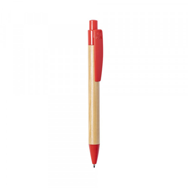 Natuurlijn balpen met opdrukmechanisme. Combinatie van een lichaam in glanzende bamboe en accessoires in PLA -PolyLactic Acid-, dat wordt verkregen uit 100% natuurlijke grondstoffen zoals maïszetmeel, yucca of suikerriet, en aan het einde van zijn levensduur 100% composteerbaar kan worden gemaakt. Clip met een groot markeeroppervlak en verkrijgbaar in een brede waaier van kleuren, met blauwe inkt. PLA-label bovenop de clip
