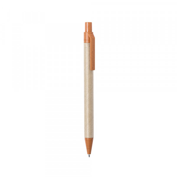 Natuurlijn balpen met push-up mechanisme. Combinatie van een lichaam van gerecycled karton in natuurlijke kleur en accessoires van tarwegriet en ABS , om het gebruik en de recycling van grondstoffen te bevorderen en zo de uitstoot van verontreinigende stoffen te verminderen. Beschikbaar in een brede waaier van kleuren, met blauwe inkt. Korenriet logo op de bovenkant van de pen.
