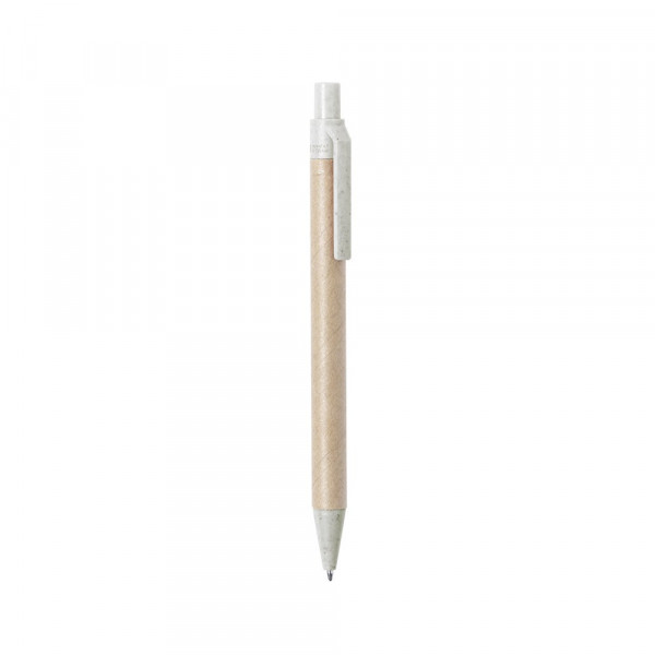 Natuurlijn balpen met push-up mechanisme. Combinatie van een lichaam van gerecycled karton in natuurlijke kleur en accessoires van tarwegriet en ABS , om het gebruik en de recycling van grondstoffen te bevorderen en zo de uitstoot van verontreinigende stoffen te verminderen. Beschikbaar in een brede waaier van kleuren, met blauwe inkt. Korenriet logo op de bovenkant van de pen.