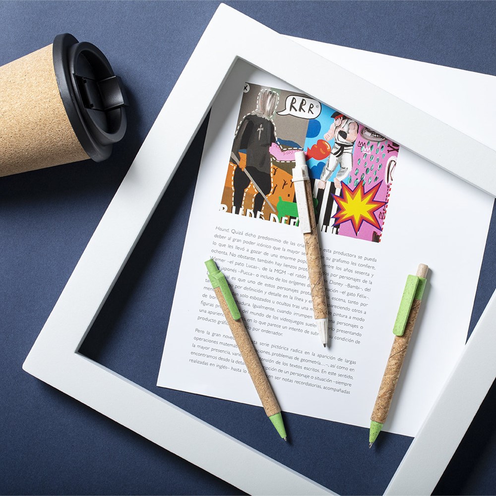 Natuurlijn balpen met drukknopmechanisme. Combinatie van een lichaam van natuurkurk en accessoires van tarwegries en ABS , om het gebruik en de recyclage van grondstoffen te bevorderen en zo de uitstoot van vervuilende stoffen te verminderen. Beschikbaar in een brede waaier van kleuren, met blauwe inkt. Korenriet logo op de bovenkant van de pen.