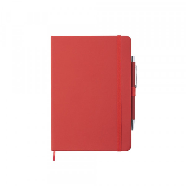 Bijpassende notitieblok en pennenset. Stevige kaft met zachte kunstleren afwerking, inclusief pennenhouder, bladwijzer en elastische sluiting, met 100 gelinieerde vellen aan de binnenkant. Ook een aluminium pen met rubberen afwerking en jumbo-lading. Verkrijgbaar in een gevarieerd kleurenpalet.