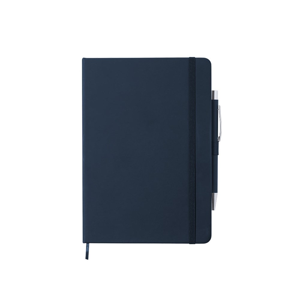 Bijpassende notitieblok en pennenset. Stevige kaft met zachte kunstleren afwerking, inclusief pennenhouder, bladwijzer en elastische sluiting, met 100 gelinieerde vellen aan de binnenkant. Ook een aluminium pen met rubberen afwerking en jumbo-lading. Verkrijgbaar in een gevarieerd kleurenpalet.