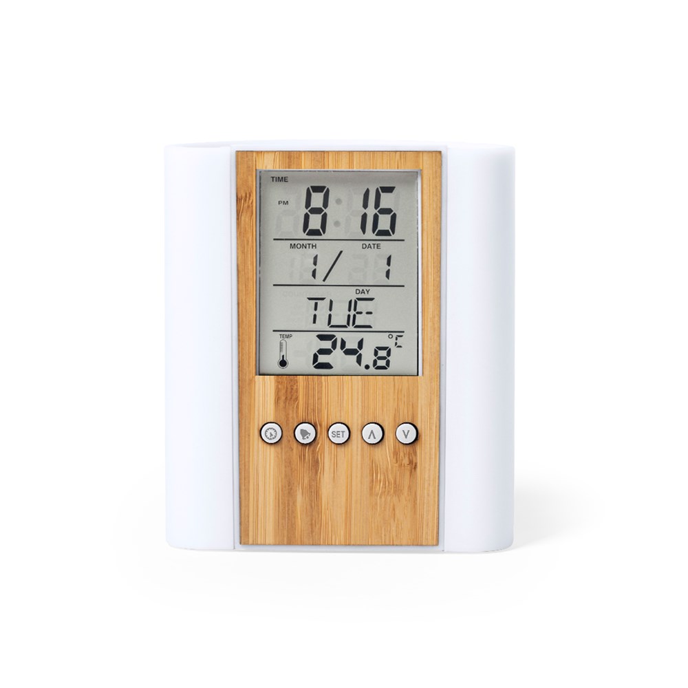 Natuurlijn pennenhouder met geïntegreerde multifunctionele klok. Gemaakt van een combinatie van bamboe en ABS materialen. Thermometer, kalender en alarmfuncties, timer en verjaardagsherinnering. Werkt op batterijen (celbatterij inbegrepen) en wordt gepresenteerd in een aantrekkelijke eco-ontwerpdoos. Gebruiksaanwijzing beschikbaar in het Spaans en Engels.