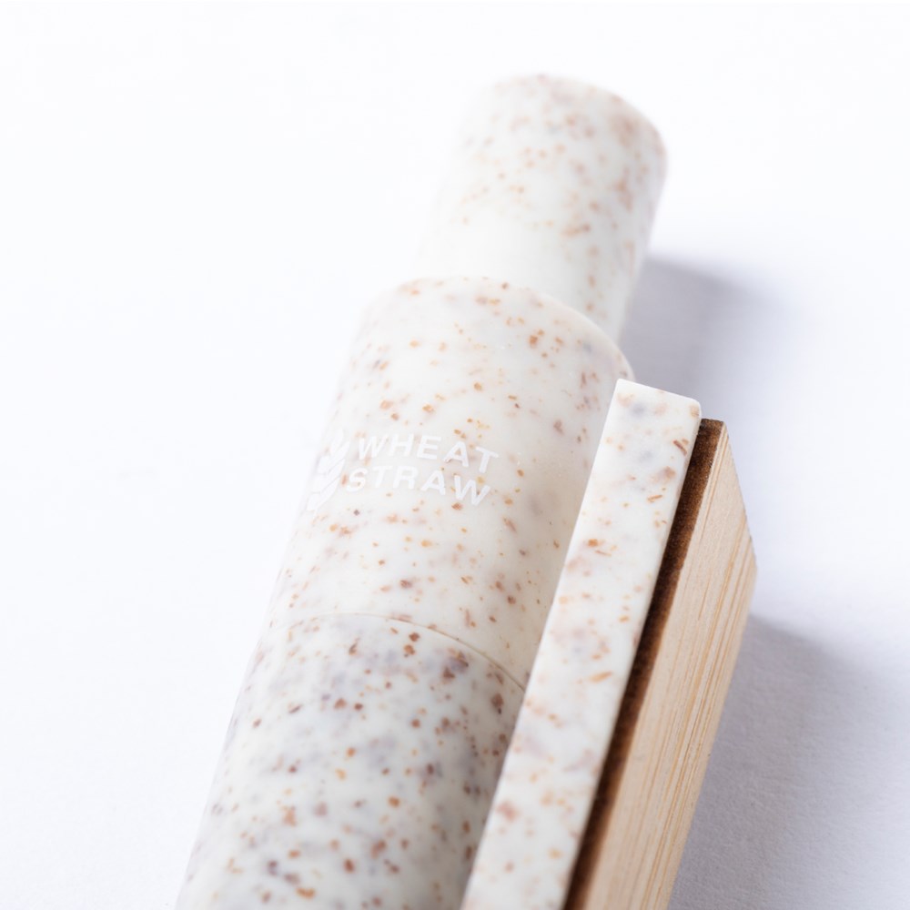Natuurlijn balpen met drukknopmechanisme. De houder is gemaakt van tarwegriet en de clip van bamboe bevordert het gebruik van natuurlijke grondstoffen en vermindert de uitstoot van verontreinigende stoffen. Clip met breed brandvlak en blauwschrijvende vulling. Tarwestro logo op het bovenste deel van de pen.