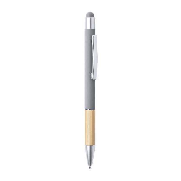 Natuurlijn balpenpointer met drukknopmechanisme. Elegant ontwerp met mat afgewerkte aluminium houder en bamboe greep, met mat afgewerkte accessoires. Metalen clip en transparante ring, met blauwschrijvende vulling. Verkrijgbaar in een brede waaier van kleuren.